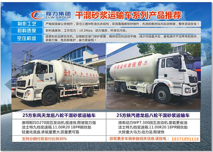 干混砂浆运输车在吸收国外同类产品先进技术的基础上改进和提高,更加适合我国的市场需要,专车专用。具有如下技术优势:
